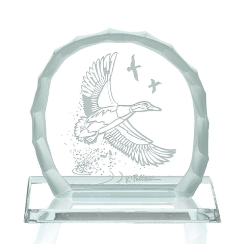 Duck Fleet, one of the Cry of the Wild series of original artwork by artist Vesa Peltonen. Depicting wildlife of the boreal forest and beyond, these ¾” jade glass pieces on a 3/8” beveled jade base are approximately 6½” wide with back edges chipped and frosted. It is accompanied by a romance card containing a short artist’s biography. Also available in a smaller freestanding version, approximately 3½” wide.
