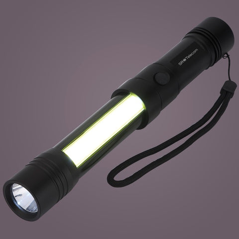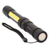 Output: up to 150 Lumens. Aluminum body. Magnetic base. Bulb Type: 3W LED and 3W COB. Function button switches between 4 modes: front (LED), barrel (COB), both front & barrel, and barrel (red COB flashing). Includes 3 x AAA batteries and hand strap. 1.25" D x 1.25" W x 9" H