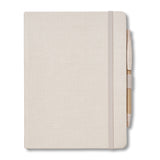 This journal has a hard cover 80 sheets 70 GSM beige wide ruled recycled paper. Includes a Kraft paper barrel pen with ABS & Wheat Straw clip and black ink and a matching elastic pen loop and elastic band. Complies with Prop 65. 8" W x 8" H x 0.5" D