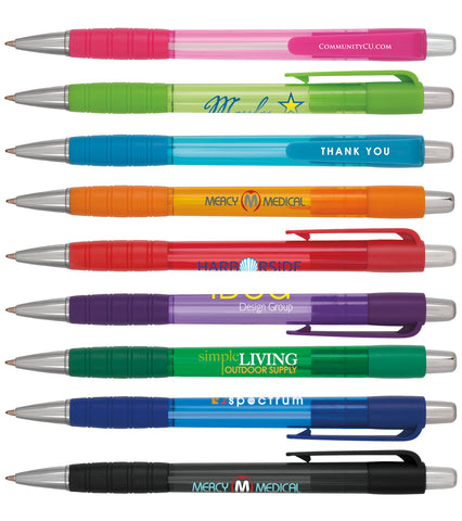 Translucent corporate colors with a grip make this a great pen for your next promotion!