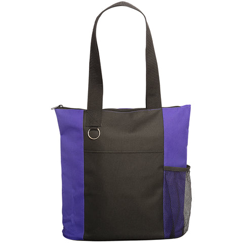 The zipper trade show tote is made of 600D Polyester with PVC coating for durability. It has a metal key ring attachment on the front above the pocket. The front open pocket measures 8"w x 9.25"h. Side mesh pocket measures approx. 4"w x 7.5"h, and features an elastic top that is ideal for a water bottle. The polyester web carrying handles measure 26"l x 1.5"w. The recommended weight tolerance is 22 lbs. Hand wash only. Complies with Prop 65. 14" W x 13.75" H x 4.75" D