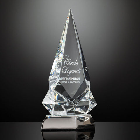 The Exalt is an extraordinary spear of optic crystal with deep cut bevels to form this exquisite sculpture. When light strikes its surface the thick and thin bevels create a rainbow glow. The award is mounted to a mirror topped, brightly plated silver or gold cast metal base.