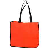 Made from 9GSM non-woven polypropylene containing 40% recycled content. Great large size for everyday use. Stylish contrast gusset (except black) design will help enhance your brand with retail flair. Features 24" handles that are cross-stitched for durability. 16" W x 14" H x 6" D