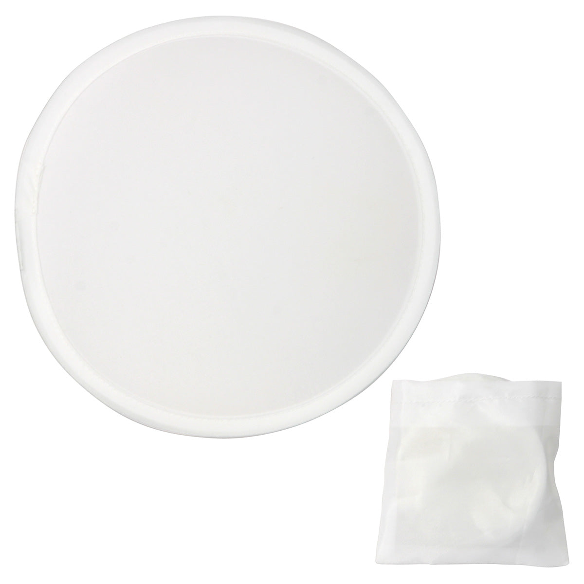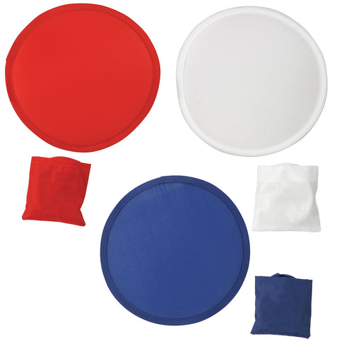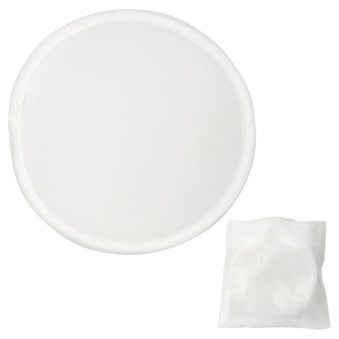 Foldable featherweight nylon fan, expands from folded 3'' pocket size to 8'' with a simple twist, Use as a fan or flying disc. Complies with Prop 65. 0.75" L x 3.125" W x 3.125" H