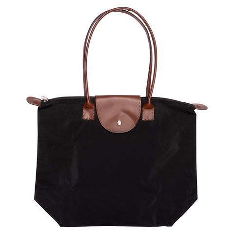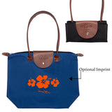 This bag may also fold into a small rectangle, to be held in place by the flap with the snap closure. It is hand wash only. Handles measure approximately 24"l. The recommended weight tolerance is 22 lbs. Production time may vary due to imprint method. Complies with Prop 65. 15.5" W x 13" H x 5.5" D