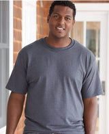 Live ultra comfortably thanks to a lay flat collar and tag free tailoring in this Hanes® Beefy-T® tall, 6.1 Oz., 100% ringspun cotton t-shirt with shoulder-to-shoulder taping, cover stitched collar, and double needle stitched sleeves. Ash Gray is 99/1 cotton/polyester. Charcoal Heather is 60/40 cotton/polyester. Light Steel is 90/10 cotton/polyester. Complies with Prop 65.