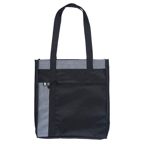 600D Polyester tradeshow tote reminiscent of Mondrian's famous color boxes. It features a large open main compartment, a front zipper pocket: 9.75"w x 10"h, and a metal split ring on the front to attach keys or badge. Hand-wash only, wipe clean with damp cloth. Store in a dry place away from direct sunlight Recommended weight tolerance: 22 lbs. Production time may vary due to imprint method. Complies with Prop 65. 13.25" W x 14.75" H x 2" D