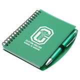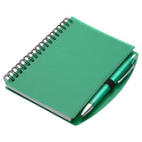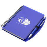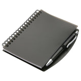 Hardcover Notebook & Pen set is spiral bound vinyl cover notebook featuring a color matched ball point pen, with black ink, inserted in the elastic pen loop and has 50 sheets (100 pages) of white ruled paper. Complies with Prop 65. 5.25" L x 0.625" W x 6.125" H