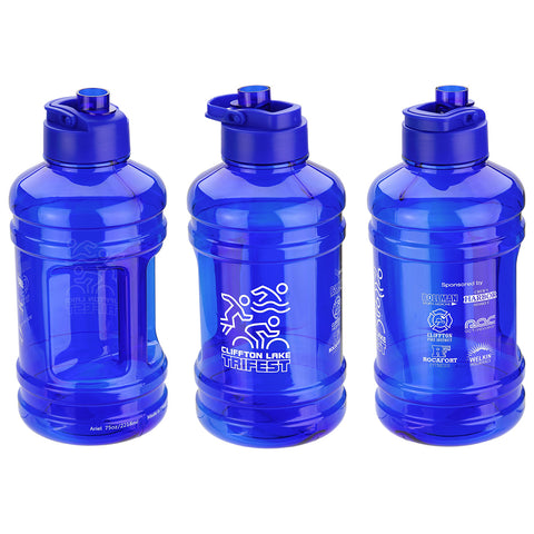 Hercules 75 oz Water Jug features an extra large capacity of 75ounces and has built-in carrying handle, flip-top screw-on lid, and wide mouth opening for easy cleaning. Great for wellness and fitness, to stay hydrated without requiring frequent refilling. Complies with FDA, Prop 65. 10.875" H x 5" Diameter
