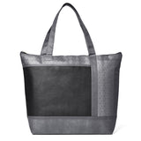 Insulated tote bag made of solid and silver tonal hexagon accent panel 80 GSM non-woven polypropylene with padded aluminum foil lining. Handles are 19"L x 1"W. It holds 18 cans of your favorite 12 Oz. beverage can. Front pocket with hook and loop style closure measures approximately 11.5"w x 8"h. Recommended weight tolerance: 22 lbs. Production time may vary due to imprint method. Complies with Prop 65. 13" W x 11.5" H x 4.75" D