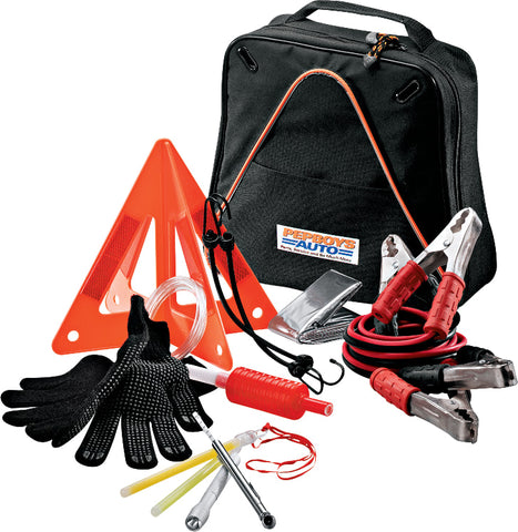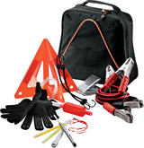 The Highway Companion Gift Set provides safety and peace of mind on the road. This 12-piece set includes 200 amp jumper cables, warning triangle, gas siphon, Mylar blanket for staying warm, two bungee cords, two glow sticks, a pair of gloves with rubber grips, flashlight (two AAA batteries included), and 50 PSI tire gauge. The Highway Companion Gift Set includes a carrying case with organizational pockets. Refer to the car manufacture manual for choosing jumper cables with an amperage rating that matches your car's battery needs to ensure safe and effective jump starting. 4" D x 13" W x 13" H