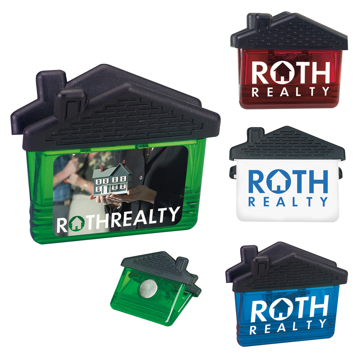 The house clip is sure to be a big hit in the real estate and mortgage industry! This clip can hold paper while attaching itself to a magnetic surface. Use it to post your to-do list or as a chip clip to keep your favorite snacks fresh. 2.875" W x 2.5" H x 1.25" D