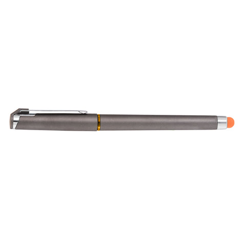 The Islander Softy Gel pen combines two customer-favorites: a gel pen and a soft-touch rubberized finish. This ultra-sleek capped pen is a satin Gunmetal Gray color with a black rubberized grip and chrome trim and accents. Customize with choice of a colorful translucent accent where the grip meets the barrel, and a matching colorful stylus. A great item for trade shows, job fairs, and so much more. Customize with your logo, imprinted with 1-color silkscreen. Complies with Prop 65. 5.98" W x 0.47" D