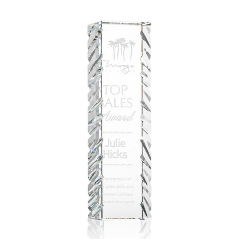 The Kaleidoscope Tower combines monolithic elegance with minimalist styling to create this exceptional gallery quality award. Diagonal faceted cuts reflect light at random angles to create a piece that glows with sparkling light.