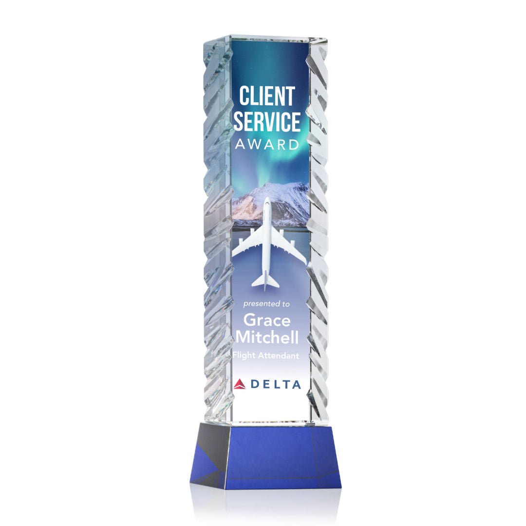 The Kaleidoscope VividPrint™ Tower combines monolithic elegance with minimalist styling to create this exceptional gallery quality award. Diagonal faceted cuts reflect light at random angles to create a piece that glows with sparkling light. Mounted on a tapered Optical Crystal base in your choice of 4 colors.