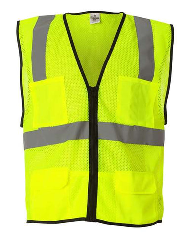 Sleeveless, 100% Polyester Mesh, Zipper Front Closure, Reflective Material, Chest Mic Tab, Patch Pocket, Flap, 2 Division Pocket, Chest Pocket, Workwear. Complies with ANSI.