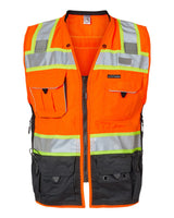 It has a heavy duty black bottom and trim to help keep a clean appearance (Size medium has no black trim on arms - will match garment color). It has left and right mic tabs (Size small only has left mic tab). It has multiple pockets: a left chest 2-tier pocket with dual function flap that can be held open by hook & loop, large right gusseted pocket with flap, outside lower front pockets with flaps, left & right stake pockets, left & right elastic pockets, and more!
