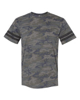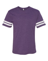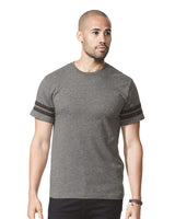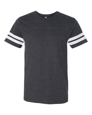 Show off your sporty style with this 4.5 Oz., 60% combed ringspun cotton, 40% polyester vintage football t-shirt. Features two white stripes on sleeves, front yoke, and 30 singles. Black/White and White/Black are 100% combed ringspun cotton. Complies with Prop 65.