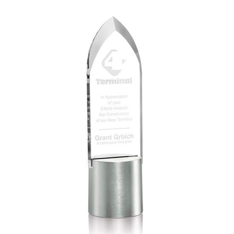 The Lafayette is one of a family of four highly attractive 10½" awards, each with a unique geometry but sharing a common visual flair. Finely beveled uprights showcase the sparkle and pure clarity of starfire glass and are inset into notched, brushed aluminum cylinders. These are elegant and substantial awards, ideal for presentation ceremonies. The bilaterally curved top margin of the Lafayette features symmetrical flaring bevels meeting at the apex.