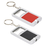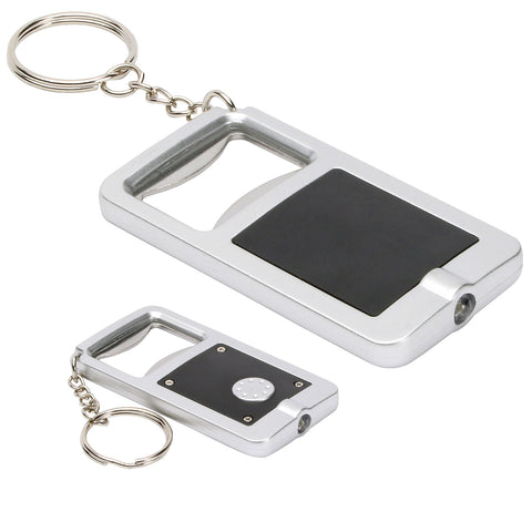 Ultra bright single LED light, Integrated bottle opener, Split key ring with chain, Button cell battery inserted. Complies with Prop 65. 2.875" L x 0.375" W x 1.5" H