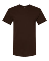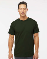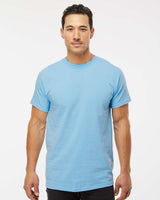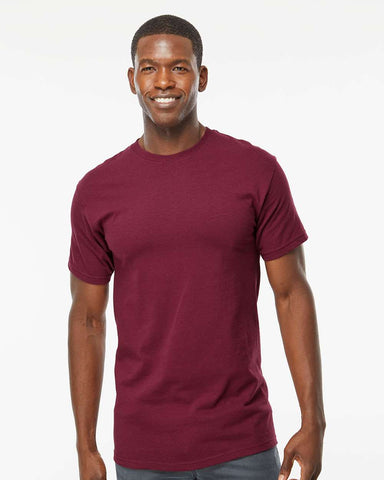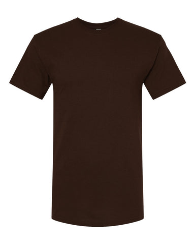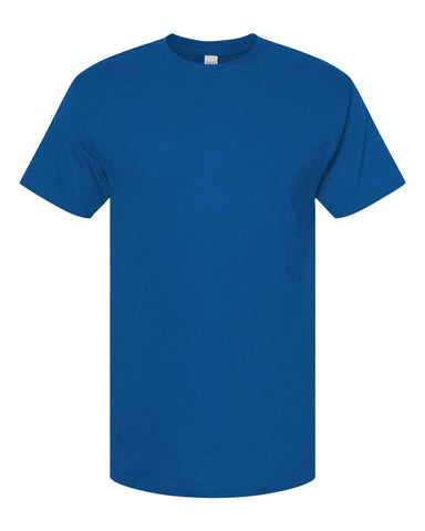 This item is 5 oz. Dark heather, heather navy, heather red, light blue heather, safety green, safety orange are 50/50 cotton/polyester. Athletic Grey is 90/10 cotton/polyester (US only) and Sport Grey is 90/10 cotton/polyester (CA only). Complies with Prop 65.