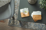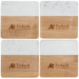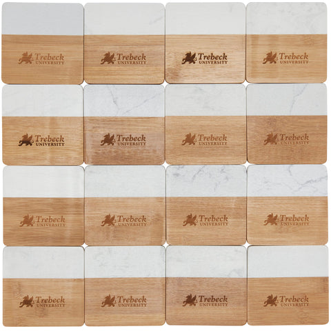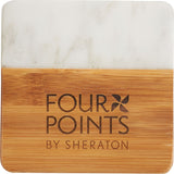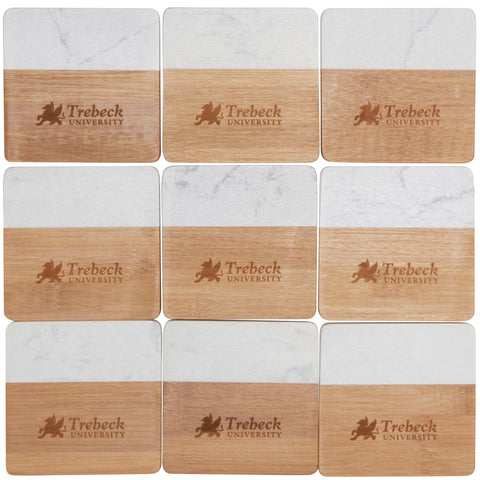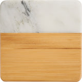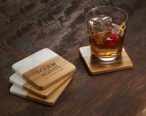Each item in the four-piece Marble and Bamboo Coaster Set is square with rounded corners, perfect for your coffee table, office desk, or nightstand. Natural variations in the marble give each piece a unique, hand-crafted look, making these coasters truly one-of-a-kind.Due to the nature of the bamboo material, variations in laser imprinting quality may occur. 1.57" D x 4.02" W x 4.02" H