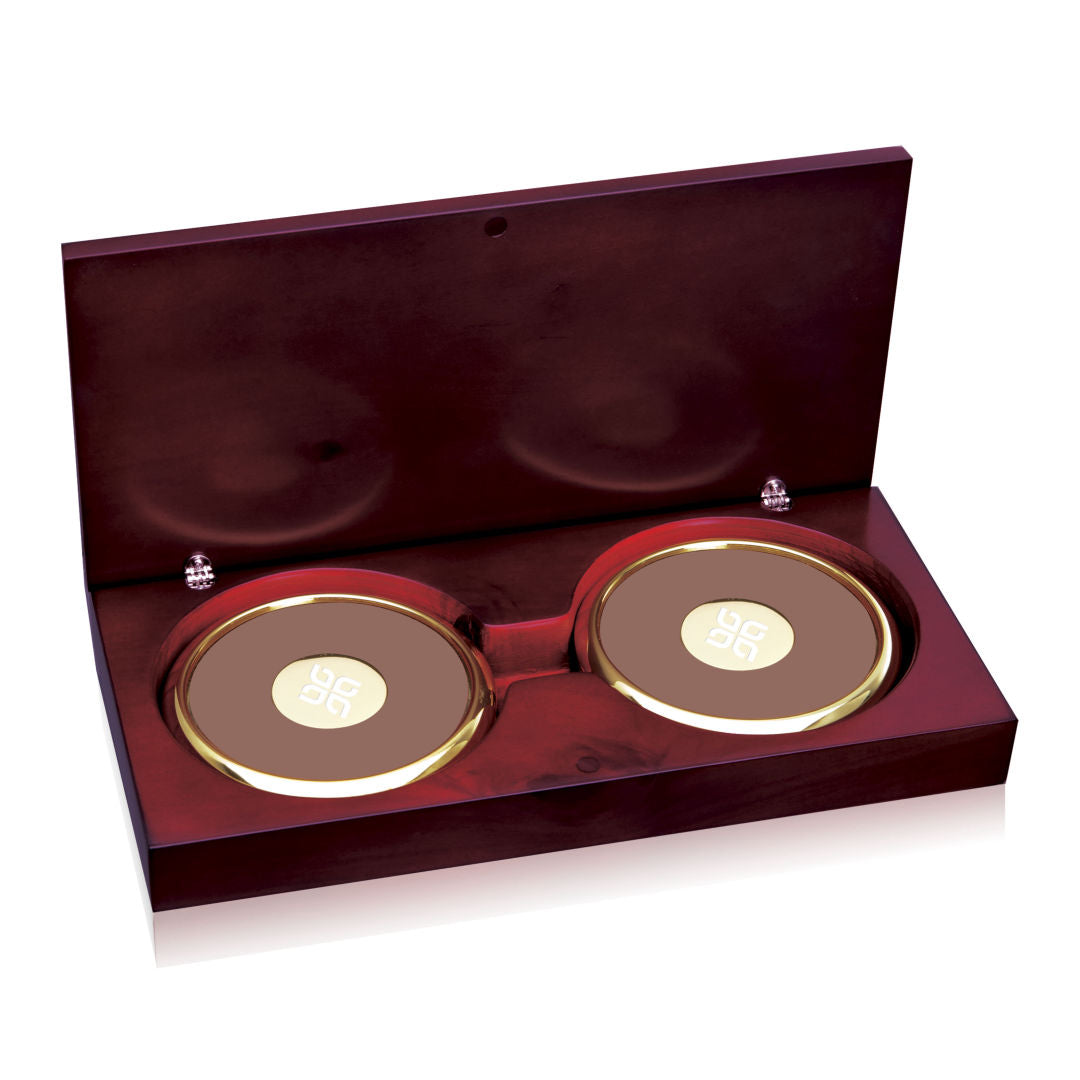 Spectacular Chrome or Gold rimmed coasters with black leatherette.