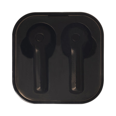 Wireless ear buds fit in left and right ports in ABS+PC Plastic charging case. Automatically turn on and pair to each other when taken out of case. Automatically turn off when placed back in charging case. Instructions and charging cable included. Includes call answer/microphone features and LED indicator light. Complies with FCC, Prop 65. 2.28" W x 2.28" H x 1.18" D