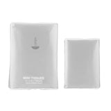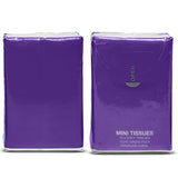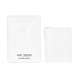 This mini tissue pack in a re-sealable PE plastic pouch. It includes ten 3-ply tissues approximately 7.875"x 8" each (not refillable). It is a perfect size to carry in your pocket. All labels are white. Complies with Prop 65. 2.125" W x 3" H x 0.875" D