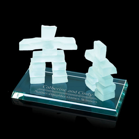 Mother & Daughter features a pair of jade glass Inukshuks, one Micro and one Mini, on a beveled 0.375” jade base. The iconic Inukshuk, emblematic of the traditional nomadic Inuit of the eastern arctic, is symbolic of cooperation and interdependence. Also available on black mirror, green marble and Sommerville bases. Includes bilingual romance card with the following description: