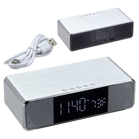 Mystic Alarm Clock with Wireless Speaker & Wireless Charger features dual 3W stereo wireless speaker. The charger is a 5W wireless charging pad and multi-function clock display with date, calendar, alarm, and temperature. Alarm clock display with backlight and multi-tone alarm with snooze option. Includes: USB Type-C cable, QI compatibility, Foreign Object Detection functionality and internal NTC temperature sensor protects charger from overheating. Output: 5V/1A & Input: 5V/3A. FCC Certified. Complies with OU, Prop 65. 6.375" L x 3.125" W x 1.875" H
