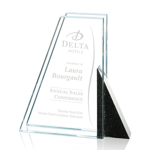 One of a series of composite awards, featuring contrasting starfire and black granite in a variety of configurations. In the Newport, an aquashaped granite triangle provides support for sloping front and back starfire pieces with polished edges.