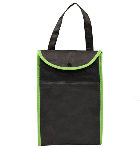 Features durable 80GSM non-woven polypropylene shell, lightweight reflective insulated lining. Fashion contrast trim that will make your brand stand out. It has hook and loop closure, clear identification holder on rear and full width front pocket. Self material carry handle is cross-stitched for durability. 7" W x 10" H x 6" D