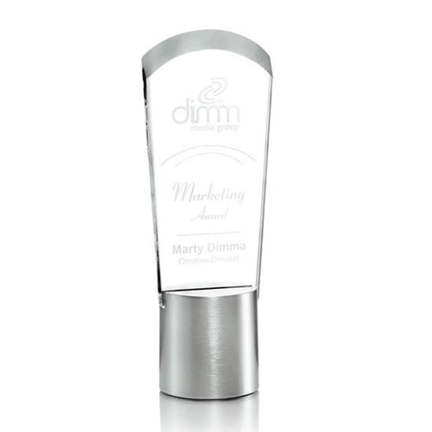 The Normandy is one of a family of four highly attractive 10½" awards, each with a unique geometry but sharing a common visual flair. Finely beveled uprights showcase the sparkle and pure clarity of starfire glass and are inset into notched, brushed aluminum cylinders. These are elegant and substantial awards, ideal for presentation ceremonies. In the Normandy, the sides flare gently and symmetrically towards a wide polished bevel at the top.