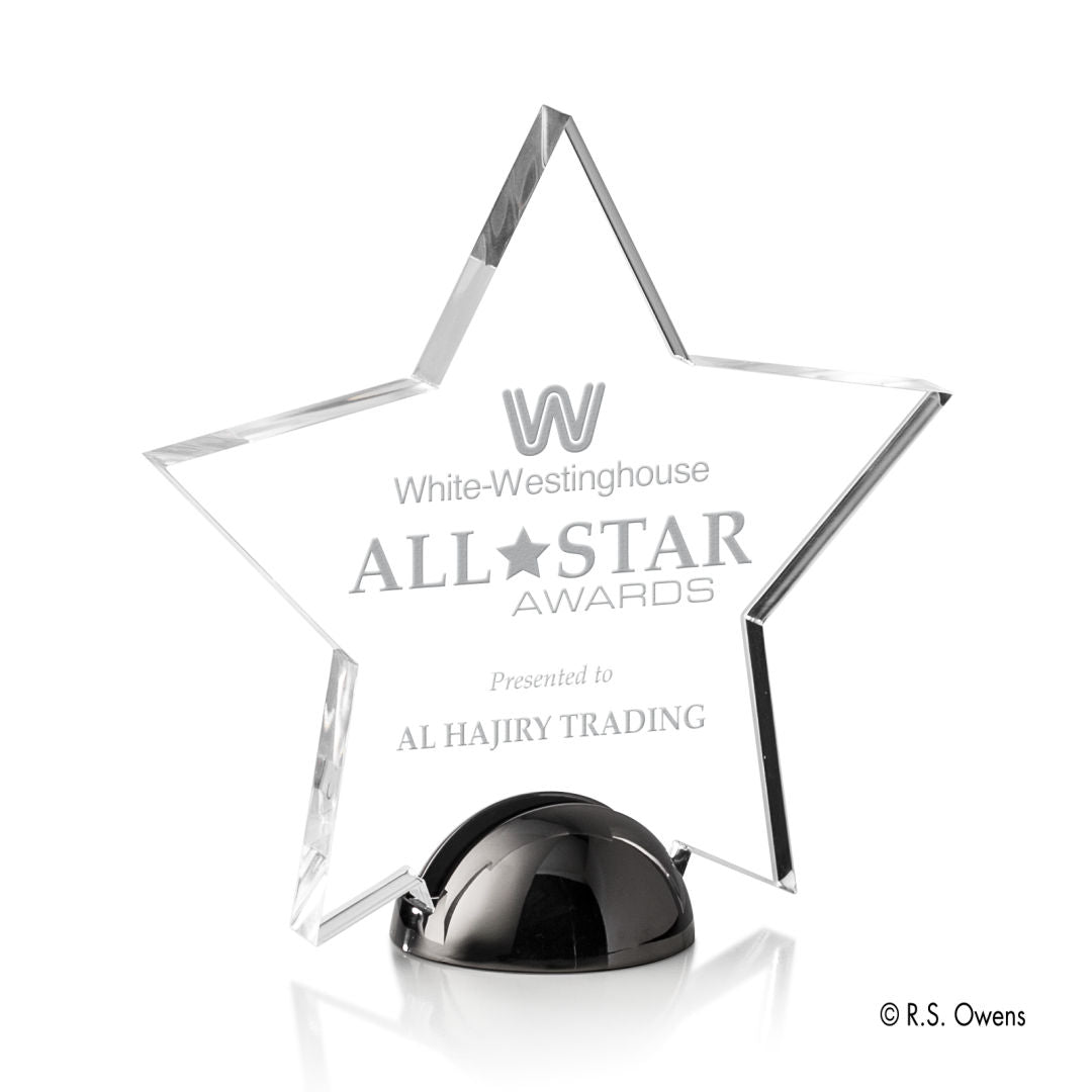 The star silhouette of the Nova Hemisphere Award is combined with a heavy Cast Metal base, beautifully polished in your choice of either Silver, Bright Gold or Black Nickel to create this modern award to recognize a star achiever.