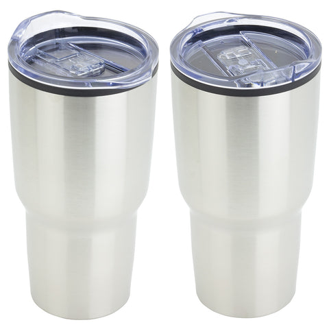Odyssey 30 oz Stainless Steel/Polypropylene Travel Tumbler features stainless steel outer shell with black polypropylene inner lining, clear plastic lid with sliding drink opening. Keeps beverages hot or cold for up to 3 hours. Non-slip base pad on bottom. Tapered bottom fits cup holders. Hand wash only. BPA Free and FDA certified. An economical alternative to our popular Belmont 30 oz. Tumbler: DTM-BL17. Complies with FDA, Prop 65. 8" H x 3.75" Diameter