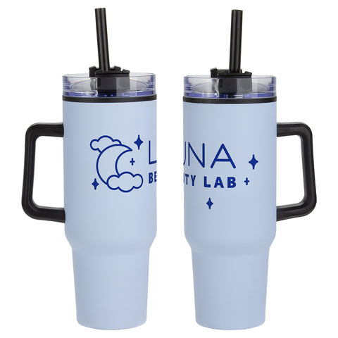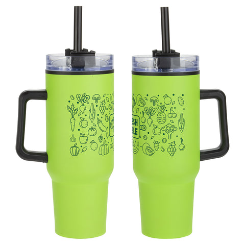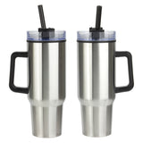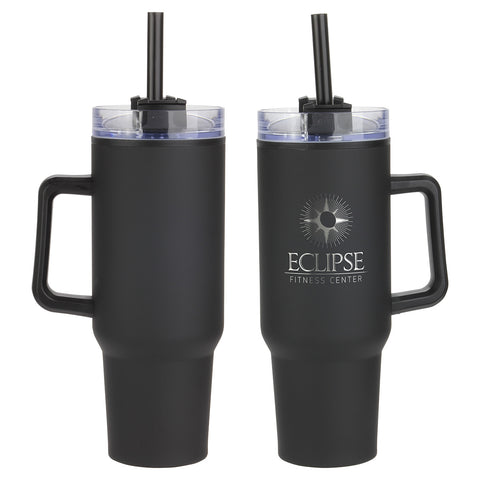 Outpost 40 oz Mug with Straw is a popular dupe for retail. Made of stainless steel outer shell with black polypropylene inner lining. Comes with clear screw-on lid with a high-wall leak resistant feature, and has 3-position black swivel top. Also comes with black plastic straw with ring to keep it inside, and black plastic handle that is 4" tall and sticks out 1-1/4" at the widest part. Keeps drinks hot or cold for up to 3 hours. Hand wash only. BPA Free and FDA certified. Complies with FDA, Prop 65. 10.5" H x 3.875" Diameter