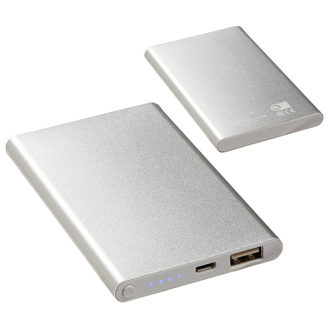 4000mAh capacity power bank in a slim aluminum exterior, 4 LED power indicatory lights, micro to regular USB cord included, UL certified Li-Polymer battery. Complies with Prop 65, UL, UN38.3. 4.25" L x 0.375" W x 2.625" H