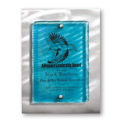 A radial brushed aluminum surfaced plaque holds the Pennant art glass with silver finished stand offs. The Pennant is created from peridot bubble glass or topaz blue striated glass to make a dramatic statement about your victory.
