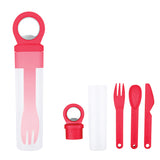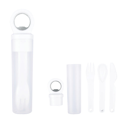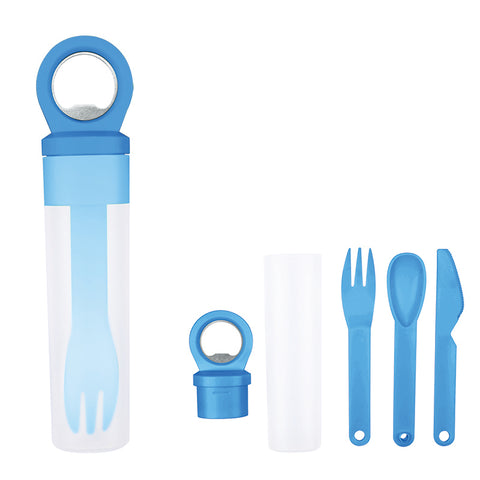 This four piece cutlery set includes HIPS plastic utensils in PP plastic case with built-in bottle opener lid. Utensils included are spoon, fork and knife. Utensils each measure approximately 5"l. Case, bottle opener, and utensils are hand wash only. Compact set is also a great way to be eco-friendly. Keep with you for picnics, school lunches or anything on the go instead of using disposable cutlery. Imprint available on case exterior only. Complies with Prop 65. 6.75" L x 1.5" H x 0.75" D
