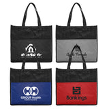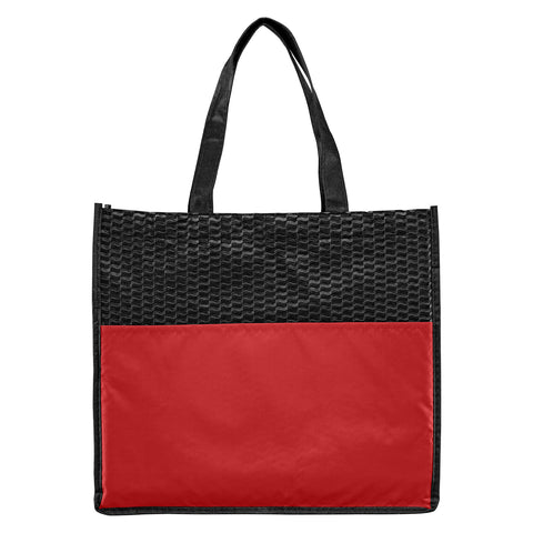 Our Plaza Deluxe Non-Woven Convention Tote Bag features a Black Color Wave Pattern polyester and a pocketâ?? to hold keys, pens, and notepads. The classic corporate accent colors make the crisp white company logos, brand messages, and design pop! It is perfect for convention giveaways â??and employee recognition and holds up to 11 L with a max weight of 5 kg. Customize with your 1-color silkscreen logo. Complies with Prop 65. 14.57" W x 12.99" H x 3.94" Diameter