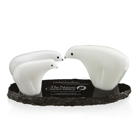 The Polar Bear Family of 3 features stylized figures in opaque, polished white glass, permanently affixed to a polished black granite base with irregular chipped edges. This whimsical interpretation of a family group in the iconic arctic mammal features 4", 5" and 6" wide figurines. A lovely memento for environmental and conservation organizations or for anyone with a fondness for these magnificent creatures.