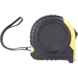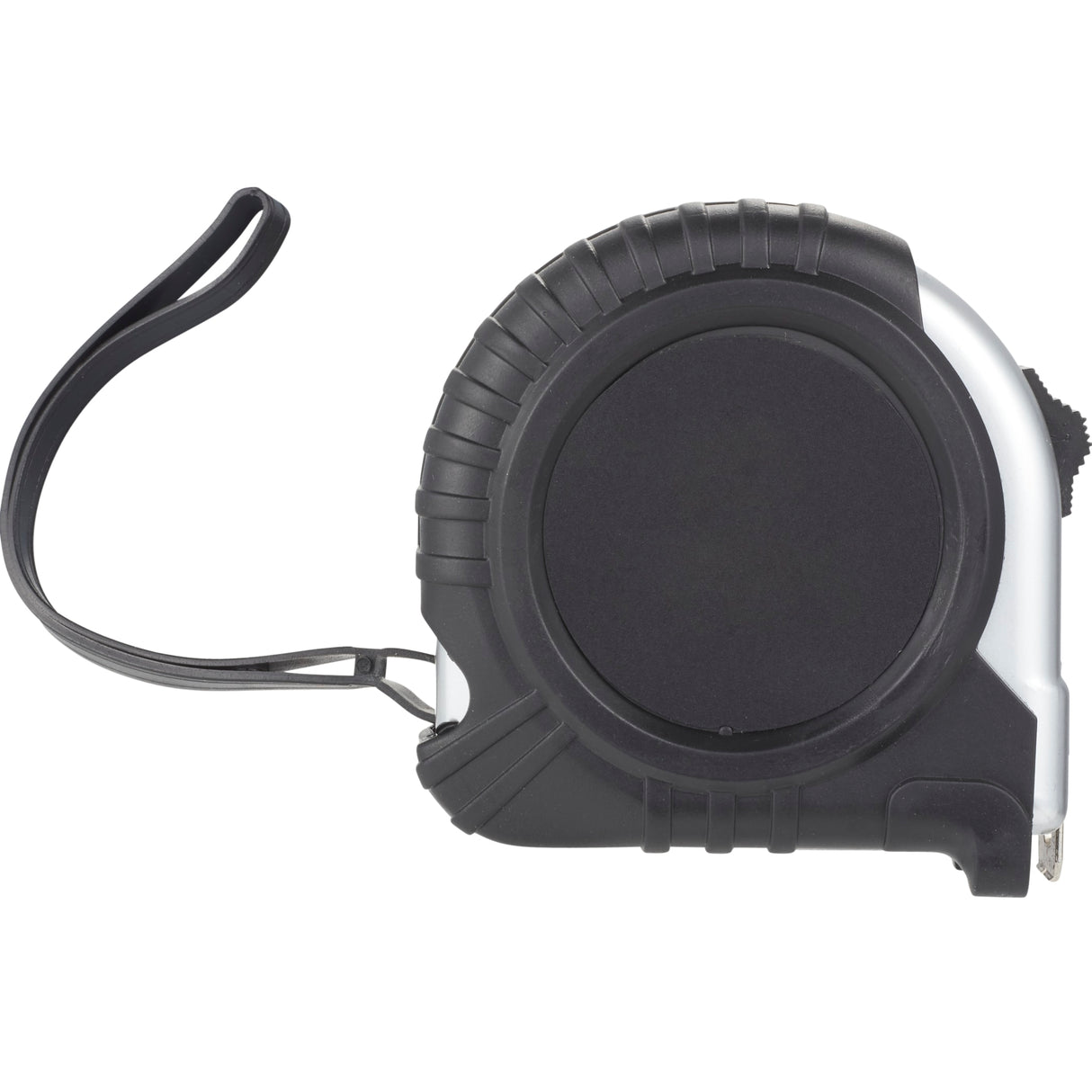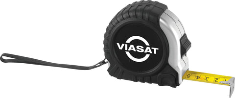 The Bullet Pro Locking Tape Measure includes a 25-foot retractable tape measure with standard and metric measurements. It features a rubber casing, a rubberized wrist strap, and a metal belt clip for convenient carrying. The slide locking button locks the tape in place. 3.19" W x 3.19" H