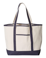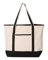 This tote bag features a square front pocket that measures 9 ½"Wx9"H with a 8 ½" W zipper. Complies with Prop 65. 18" W x 14" H x 4 1/2" D
