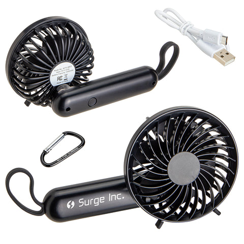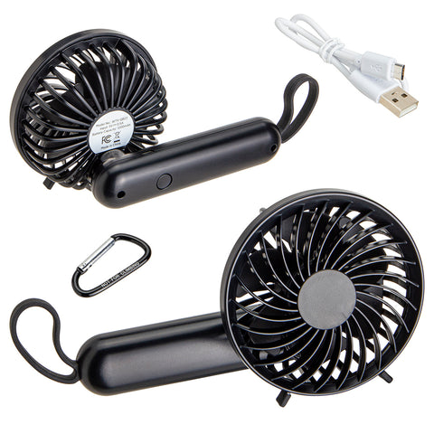 Stay cool with our Quiet Breeze Rechargeable Hand Fan with Carabiner! Fan is lightweight and ergonomic with a quiet brushless motor and three speeds controlled by button on the back. Fan rotates 180 degrees with silicone stoppers to set on any surface. Includes a metal carabiner that can be clipped to the silicone carry strap and used to attach fan to bags, belt loop, and more! Charge the fan for 3 hours with the included Micro-USB cable and let it run up to 5 hours on a single charge. Complies with OU, Prop 65, UN38.3. 3.75" L x 2.375" W x 5.125" H