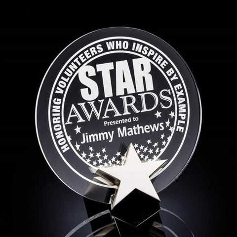 The star is gracefully translated in silver or gold plated cast metal with a dimensional trail to hold the round acrylic design securely in place. The swoosh marks laser engraved on the acrylic can be included in your imprint upon request.