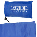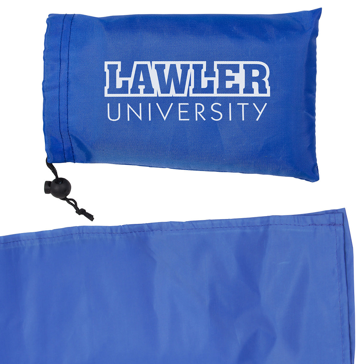 Foldable polyester water resistant blanket, Anti-wind corner design means your blanket stays put, Includes drawstring carry pouch with barrel-lock closure, 43"W X 57"L open. Complies with Prop 65. 4.75" L x 7.5" W x 0.5" H