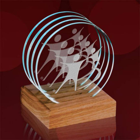 A set of four flat, circular 5/16” jade glass coasters, approximately 4” in diameter, in a slotted wood stand. Includes identical etching (on the underside) of all four coasters.