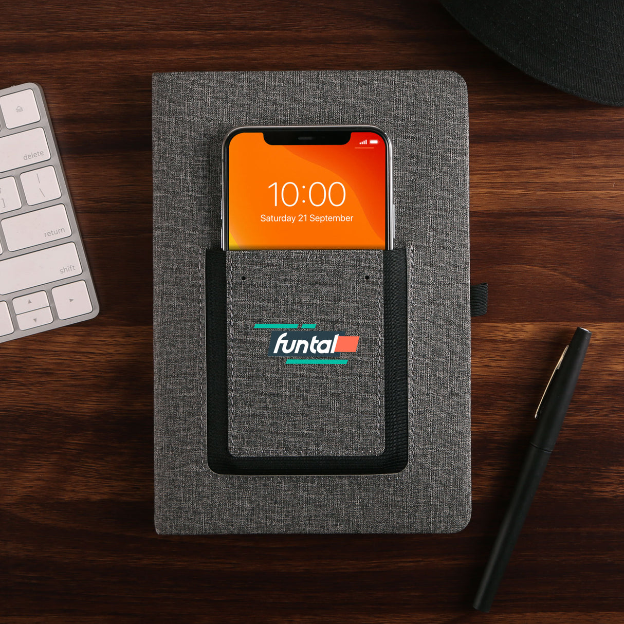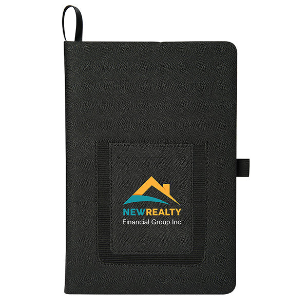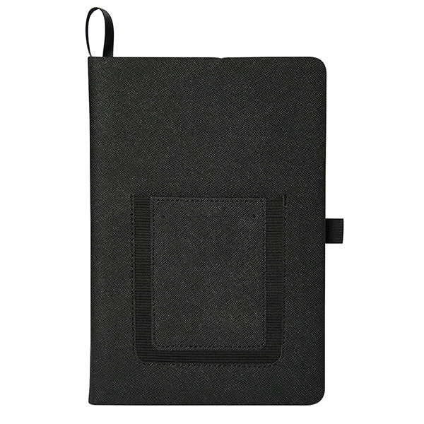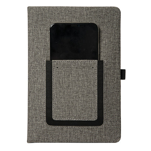 Available in trendy heatherd grey or black, the Savannah Journal screams style! The slick cover design includes a 3 way elastic expansion that's perfect for holding your phone. On top of that you have a slash pocket that perfectly fits your business cards. Complete that with 80 sheets of cream colored lined paper & you're set for any writing endeavour. Complies with Prop 65. 5.75" W x 8.25" H x 0.625" D
