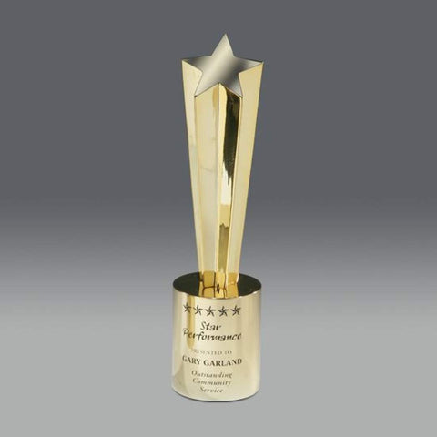 This shooting star emerges straight in the air with perfect geometry. Available in either black nickel combined with 24 karate gold plated finish or all bright 24 karat gold, the cylinder base is a perfect compliment with your accomplishment etched on the surface.